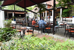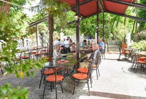 Ob Sie rustikale Gemütlichkeit lieben, ob Sie auch draußen ein Dach über dem Kopf wünschen oder Sie bei den beruhigenden Geräuschen fließenden Wassers entspannen - hier hat die Familie Gianikis ein Refugium geschaffen, das seinesgleichen sucht. Eine kleine Brücke führt über ein Bächlein, das die Terrasse durchzieht, überall grünt es verschwenderisch. Nur wenige Schritte von der Terrasse entfernt haben exotische Vögel und ein freundlicher Hofhund ihre Heimstatt. Wiederum zwei Schritte weiter gibt es Klettergerüste, Bänke, eine Schaukel und eine Kegelbahn für die kleinen Gäste. Dabei können die Eltern sich beruhigt zurücklehnen: Das Gelände ist umzäunt und wer sich von seinem Platz erhebt, der hat schnell alles im Blick.